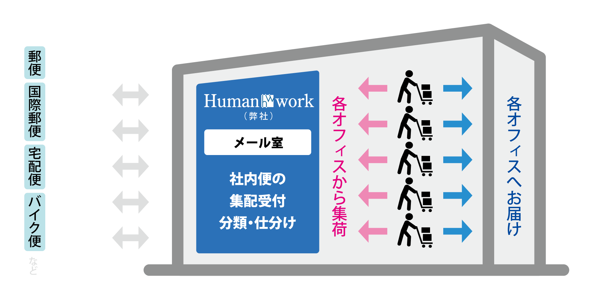 企業様内で毎日飛び交う様々な情報や荷物を、常駐スタッフが包括的に受領・管理します。決まった時間帯でのトラック搬入や、郵便・国際郵便・宅配便・バイク便での大量の書類や荷物を、分類・仕分けし、フロアへお届けします。